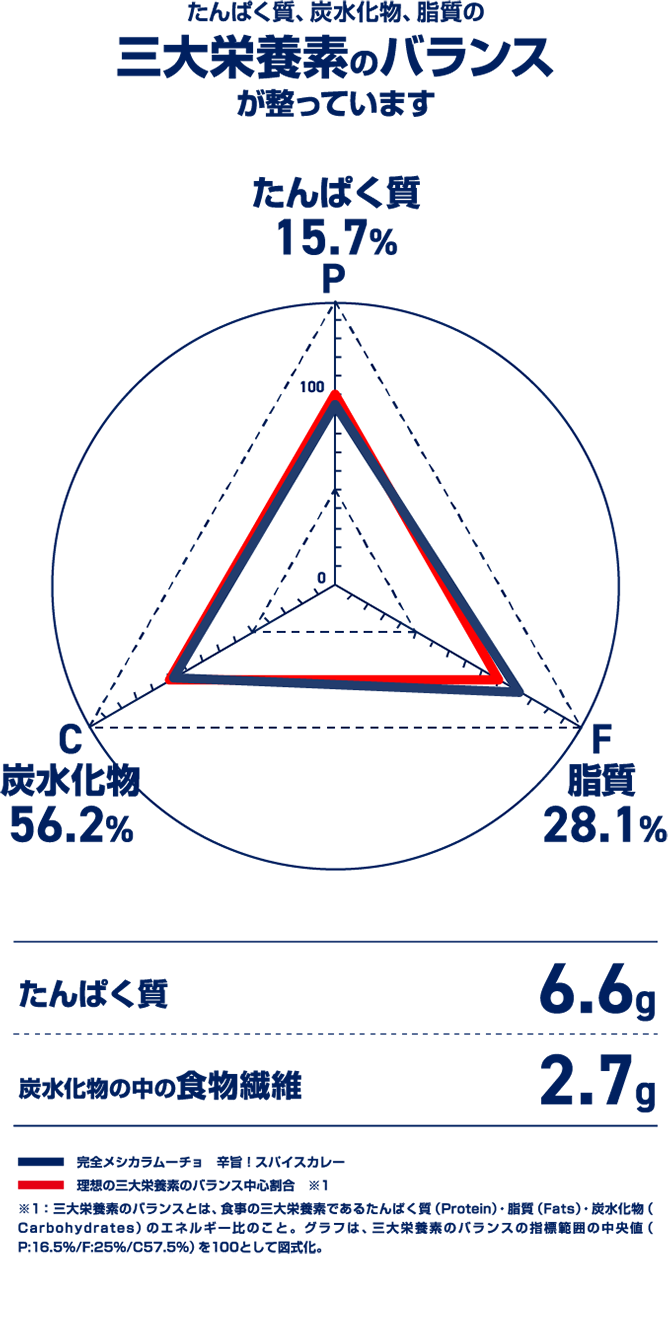 ビタミン・ミネラルなど33種類の栄養素とおいしさの完全なバランスを追求した、超進化系カラムーチョ。「完全メシ」と「カラムーチョ」の夢のコラボが実現。カリカリの食感と、複数のスパイスをブレンドした辛旨スパイスカレーの味わいでやみつきになること間違いなし!